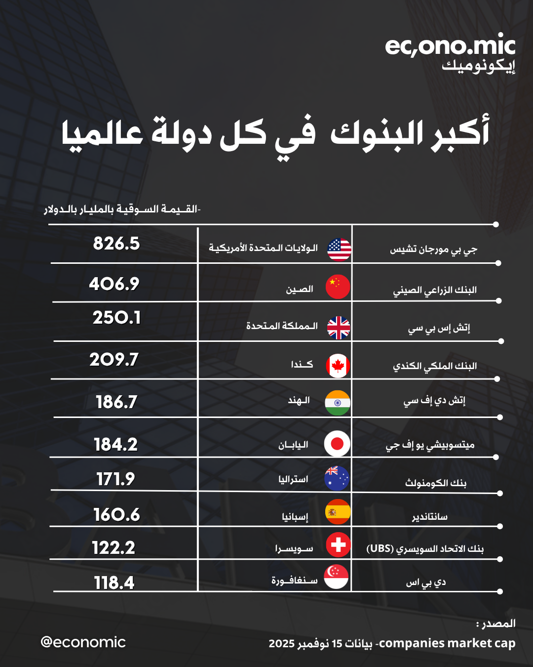 وجاء بنك (جي بي مورجان تشيس) كأكبر بنك في الولايات المتحدة، وأكبر بنك في العالم من حيث القيمة السوقية والتي بلغت 826.5 مليار دولار.