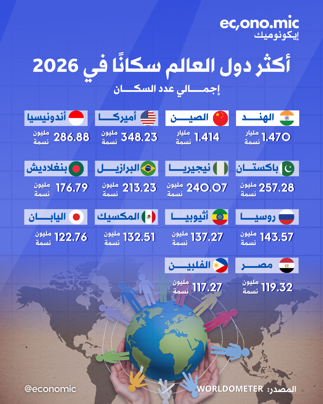 وتتصدر الهند القائمة بنحو 1.47 مليار نسمة، متقدمة على الصين التي يبلغ عدد سكانها حوالي 1.41 مليار نسمة.