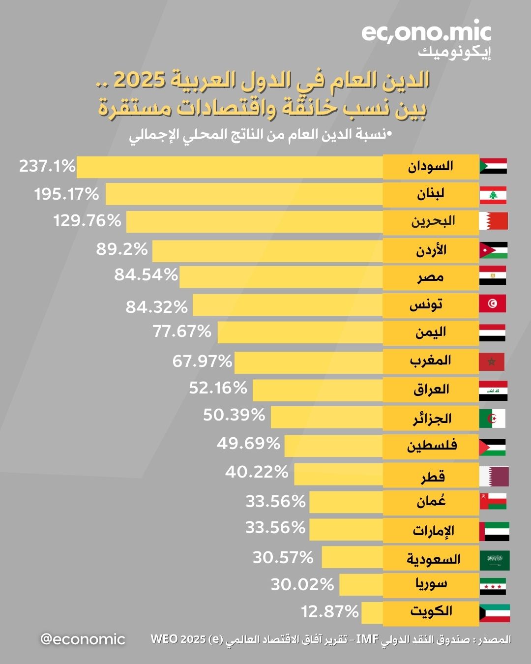 تتصدر السودان ولبنان قائمة أعلى نسب الدين العام عربياً بأكثر من 190% من الناتج المحلي