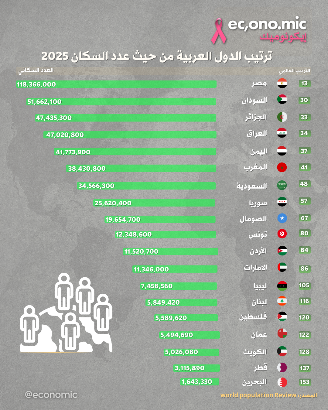 جاءت مصر في المرتبة الأولى كأكبر دولة عربية من حيث العدد السكاني، والثالثة عشر عالميا متجاوزة 118 مليون فرد، يليها السودان ثم الجزائر .