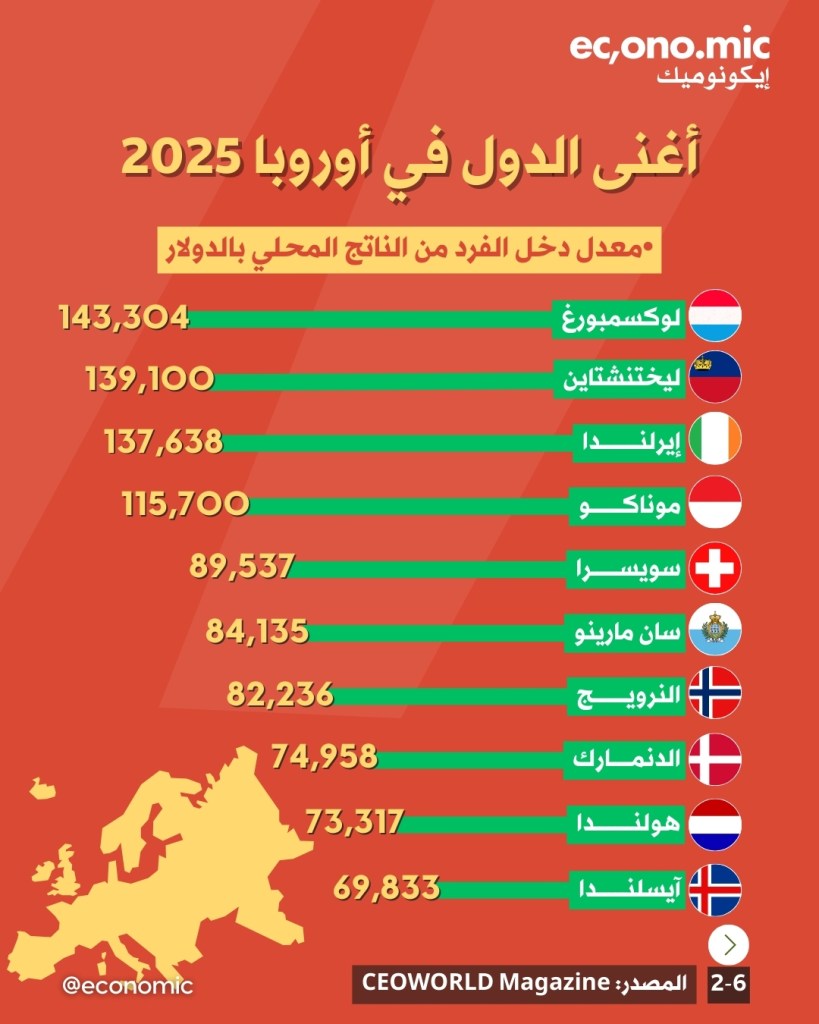 من أوروبا إلى آسيا وأفريقيا والأميركيتين وأوقيانوسياهنا قائمة أغنى 10 دول في كل قارة لعام 2025بحسب نصيب الفرد من الناتج المحلي (PPP) بالدولار