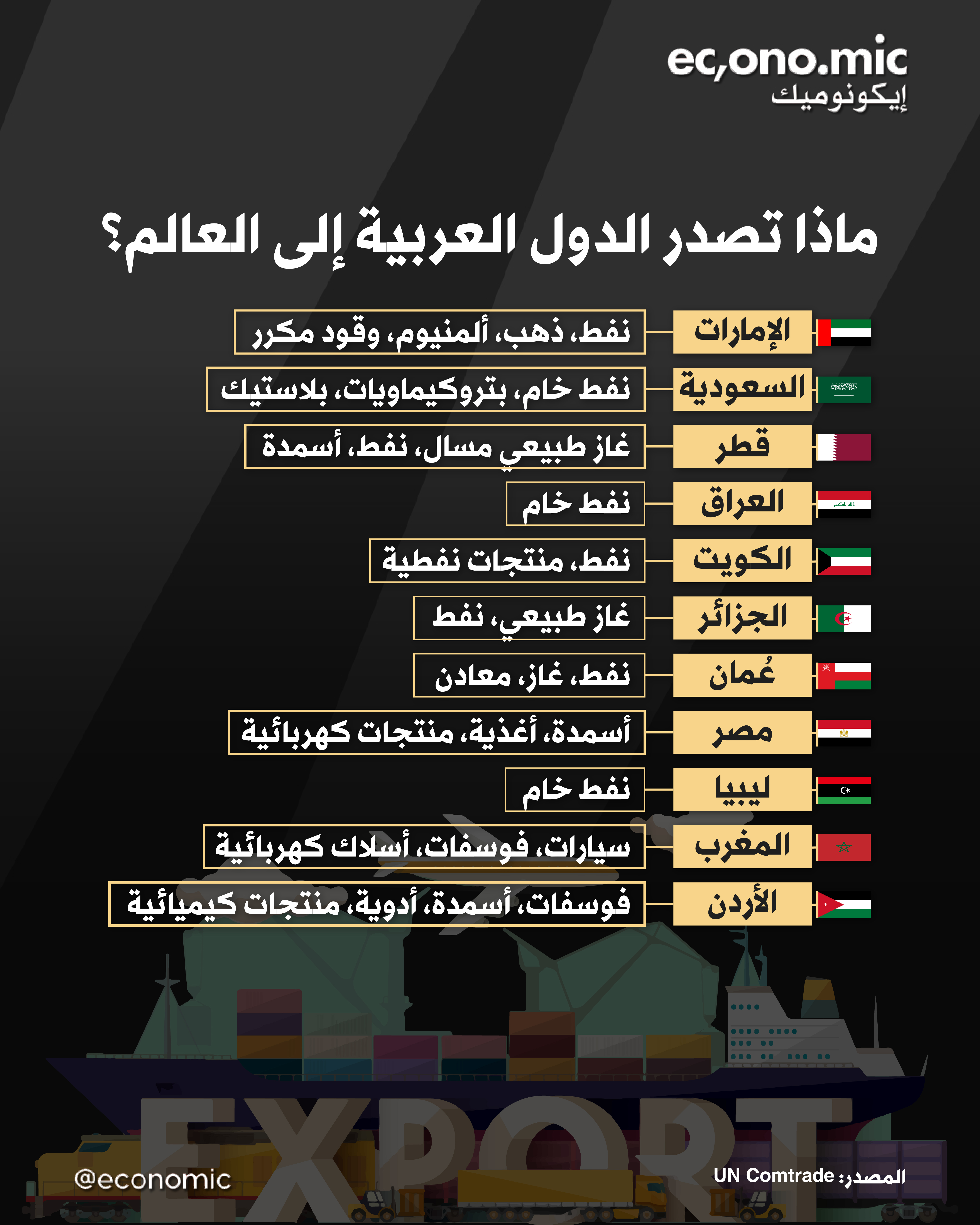 توضح البيانات تفاوت طبيعة الصادرات بين الدول العربية، حيث تتركز صادرات بعض الدول على النفط والغاز ومشتقاتهما، بينما نجحت دول أخرى في تنويع صادراتها لتشمل الصناعات التحويلية، السيارات، الأسمدة، والمعادن.