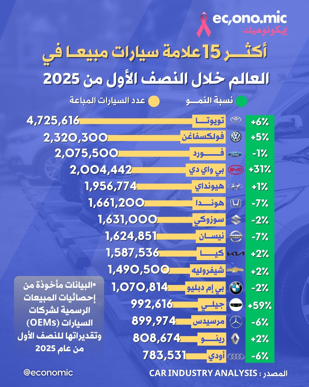 المفاجأة جاءت من BYD الصينية التي اقتحمت قائمة الخمسة الكبار، متجاوزة هوندا وهيونداي بفضل الطلب القوي في الصين وأسواق مثل البرازيل وتايلاند وأوروبا، مع توقعات أن تتخطى فورد قبل نهاية العام.