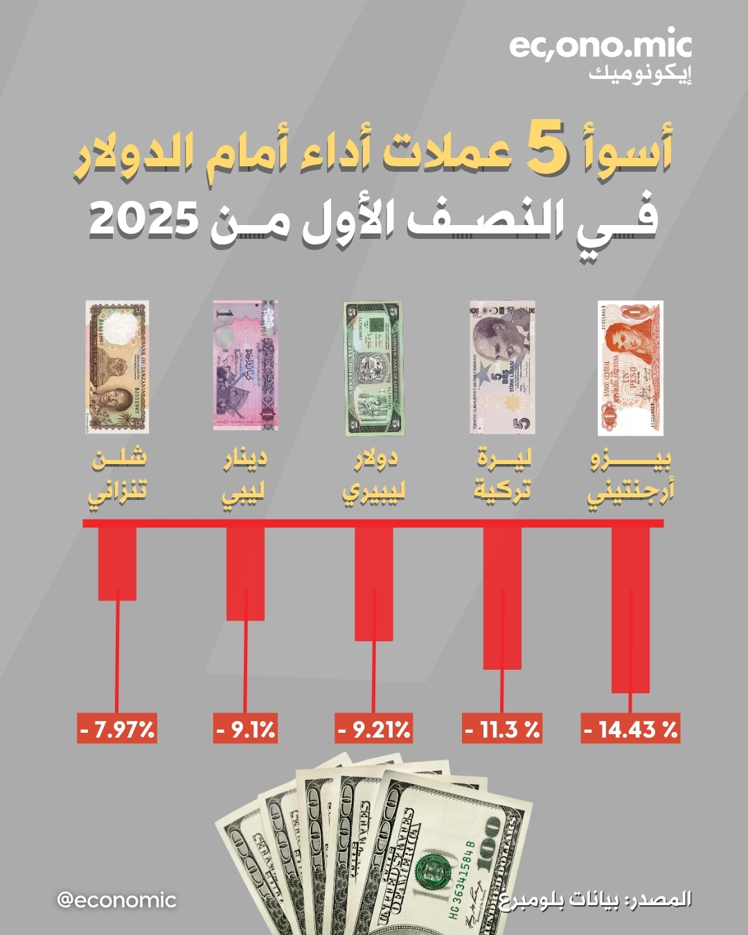 وضمت القائمة الدينار الليبي الذي تراجع بنسبة 9% أمام الدولار، ليحل في المرتبة الرابعة ضمن قائمة أسوأ العملات أداءً خلال هذه الفترة