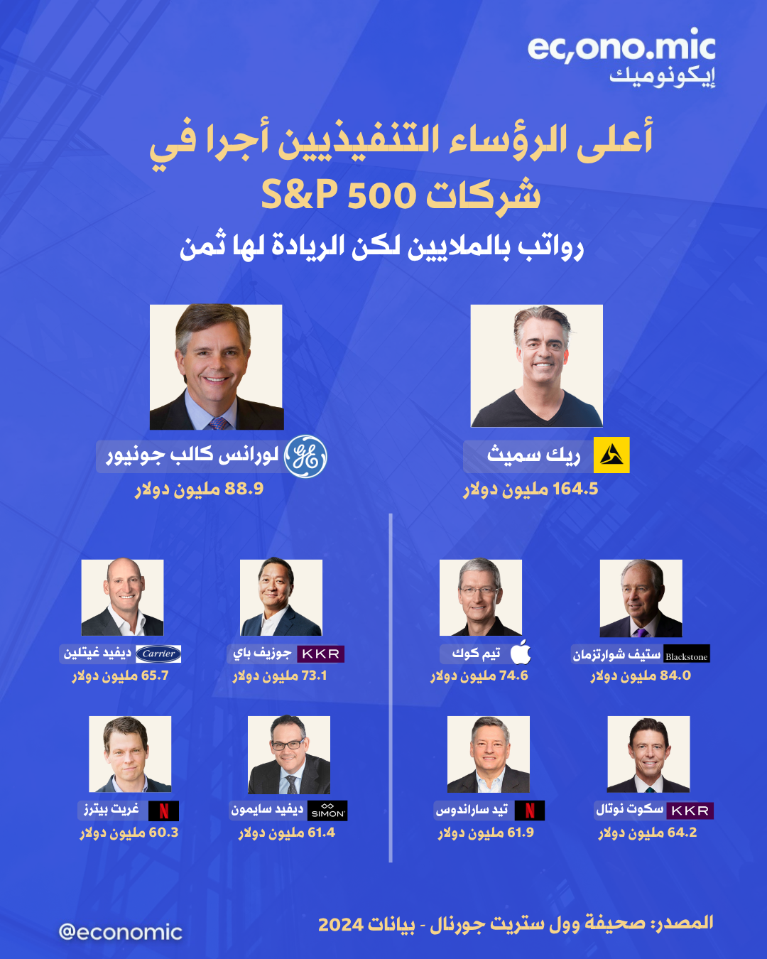 يتصدرهم Rick Smith بـ164.5 مليون دولار بينما يظهر Tim Cook من Apple بالمركز الرابع وNetflix ممثلة برئيسين تنفيذيين ضمن القائمة