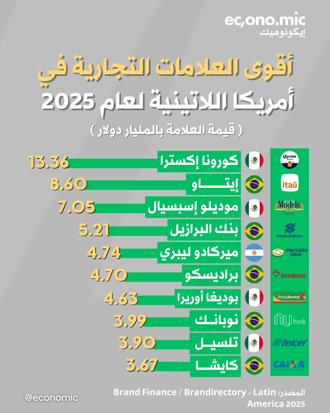 كورونا إكسترا في الصدارة بقيمة 13.36 مليار دولار تليها إيتاو بـ8.6 مليار وموديلو إسبسيال بـ7.05 مليار فيما يبرز صعود نوبانك إلى 3.99 مليار هذه هي أقوى العلامات التجارية في أمريكا اللاتينية لعام 2025 بحسب Brand Finance
