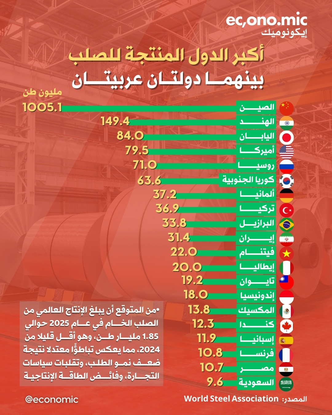 الصين تهيمن على صناعة الصلب عالميًا بأكثر من مليار طن في 2024، تليها الهند واليابان والولايات المتحدة، فيما دخلت كل من إيران ومصر والسعودية قائمة أكبر 20 منتجًا للصلب في العالم