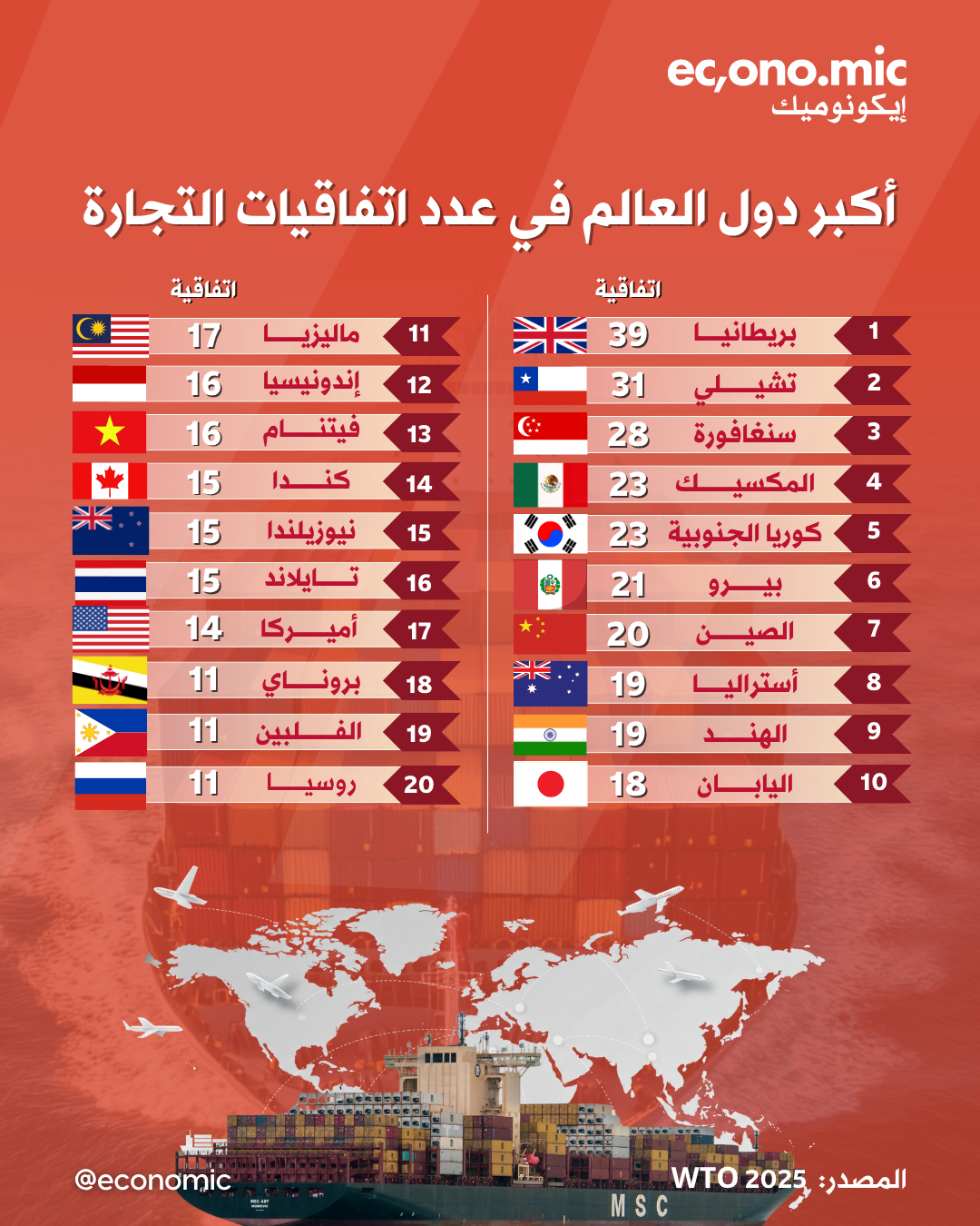 تتفاوت الدول في عدد الاتفاقيات التجارية، وتصدرت بريطانيا المرتبة الأولى بـ 39 اتفاقية، ثم تشيلي بـ31 اتفاقية، تليها سنغافورة في المرتبة الثالثة بـ 28 اتفاقية.