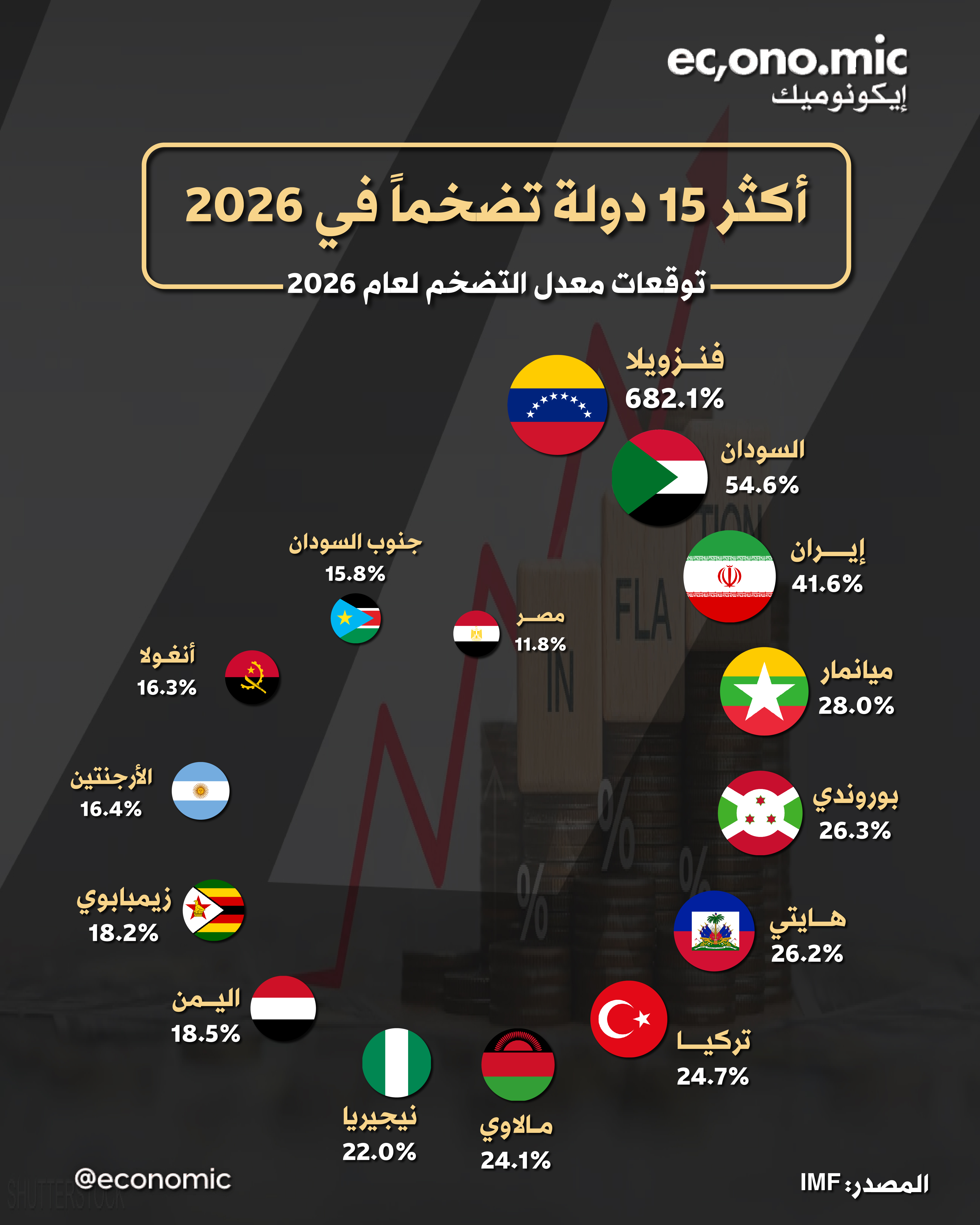 وتتصدر فنزويلا القائمة بتضخم هائل يصل إلى 682.1%، يليها السودان و إيران في المركزين الثاني والثالث بمعدلات تضخم 54.6% و 41.6% على التوالي.