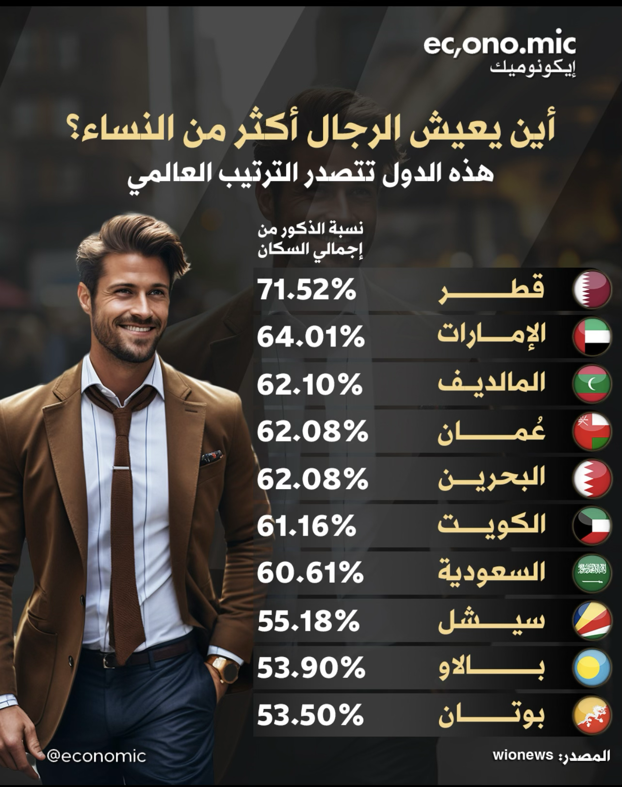 وتعتبر قطر الأولي عالميًا، حيث تضم أكبر عدد من الذكور، ليشكلون 71.52% من إجمالي السكان، يليها الإمارات في المركز الثاني بنسبة 64.01%.