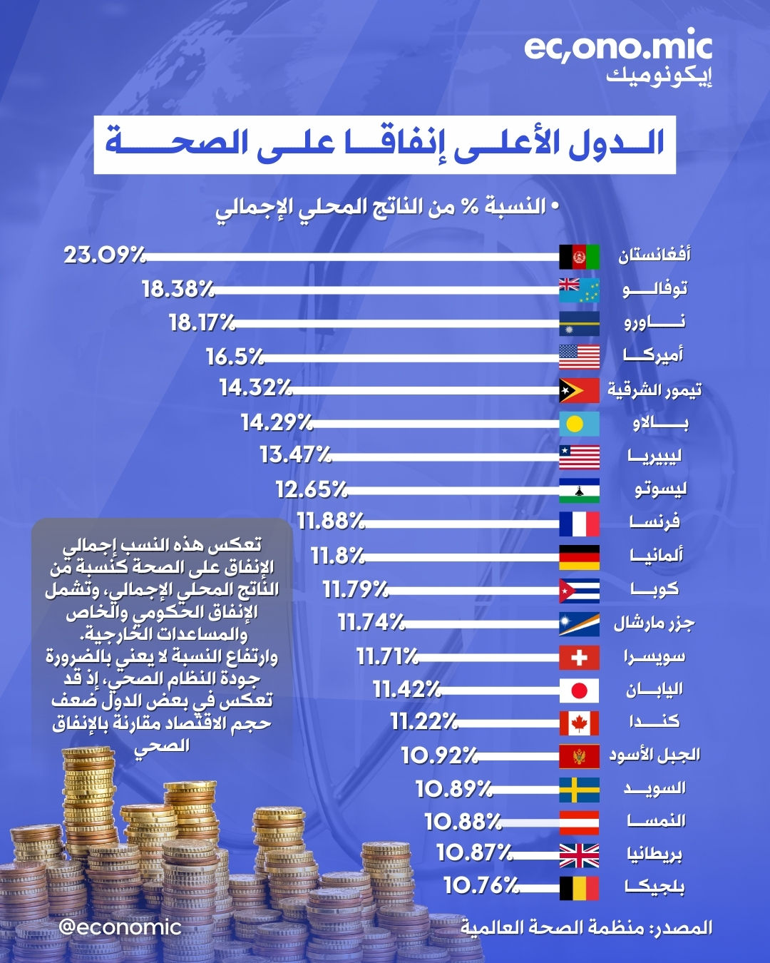 يعرض هذا التصنيف الدول الأعلى إنفاقًا على الصحة كنسبة من الناتج المحلي الإجمالي، وفق بيانات منظمة الصحة العالمية، ويقيس حجم الموارد المخصصة للقطاع الصحي مقارنة بحجم الاقتصاد، وليس مستوى جودة الخدمات الصحية أو كفاءة الأنظمة الطبية