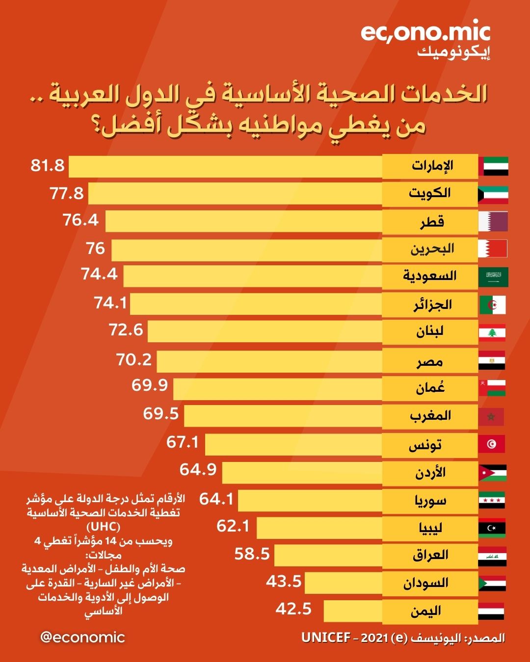 بحسب منظمة الصحة العالمية واليونيسفتتباين الدول العربية في مؤشر تغطية الخدمات الصحية الأساسية بدرجات بين 40 و80 نقطةالإمارات والكويت وقطر تتصدر بأعلى المستوياتبينما تتراجع دول مثل اليمن والسودان إلى أدنى المراتبالمؤشر لا يقيس عدد السكان المشمولين مباشرةبل يقيّم قوة أنظمة الرعاية الصحية عبر 14 خدمة أساسية تشمل الأمومة والطفولة والتحصين والأمراض المعدية وغير المعدية