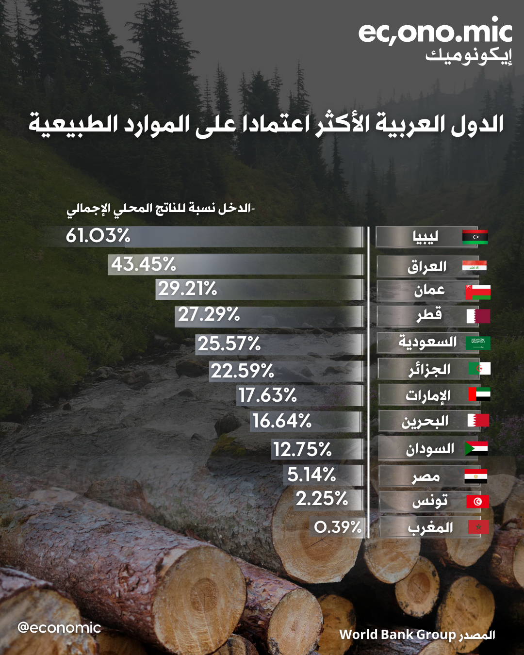 تظهر البيانات تفاوتا واضحا في درجة اعتماد الاقتصادات العربية على الموارد الطبيعية، وتتصدر ليبيا القائمة بنسبة مرتفعة تبلغ حوالي61%، تليها العراق بنحو 43.4%.