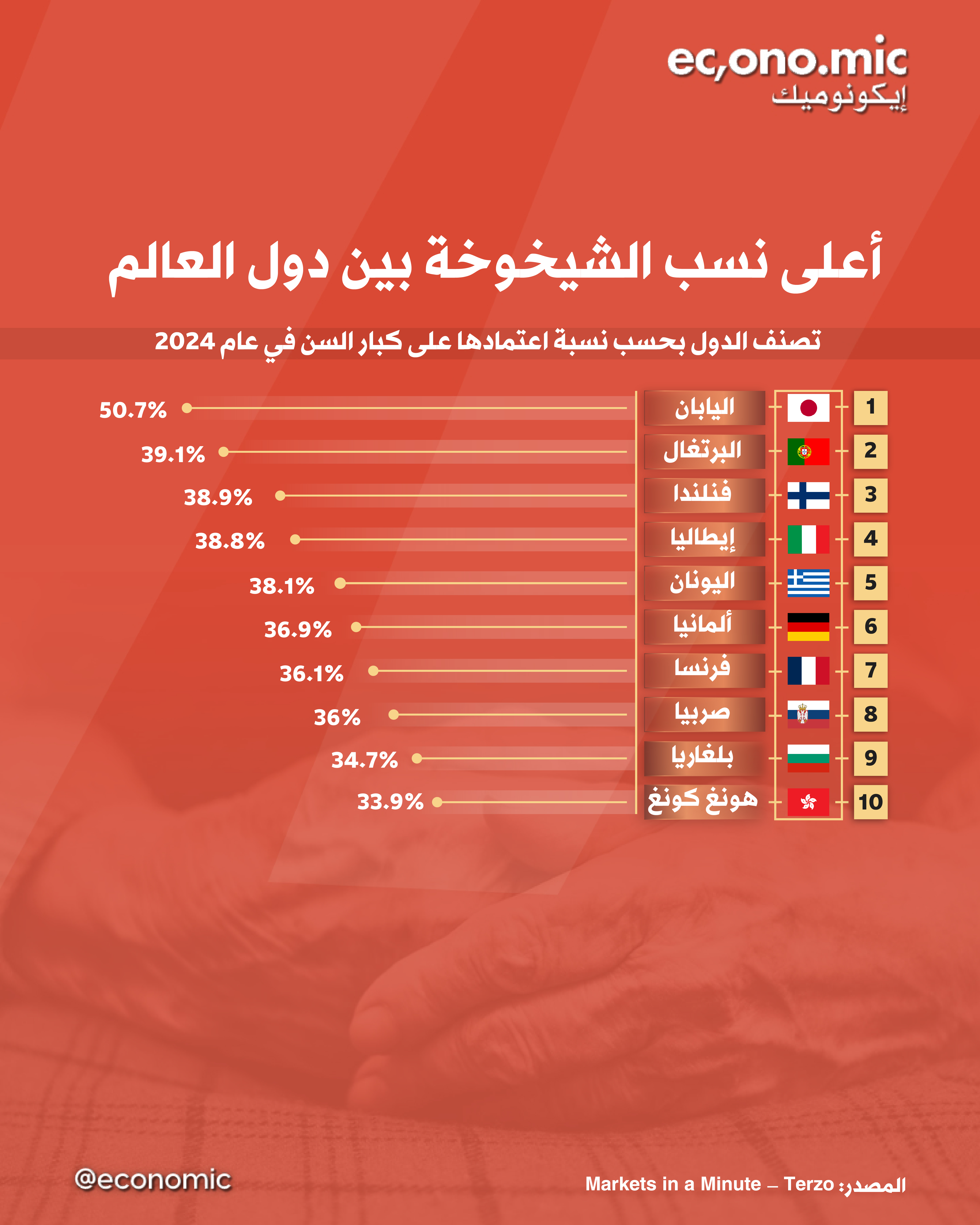 اليابان عند 50.7% تواصل تصدّر المشهد الديموغرافي، تليها البرتغال وفنلندا وإيطاليا واليونان، بينما تنضم ألمانيا وفرنسا وصربيا وبلغاريا وهونغ كونغ إلى قائمة تضم أعلى 10 نسب اعتماد على كبار السن في 2024