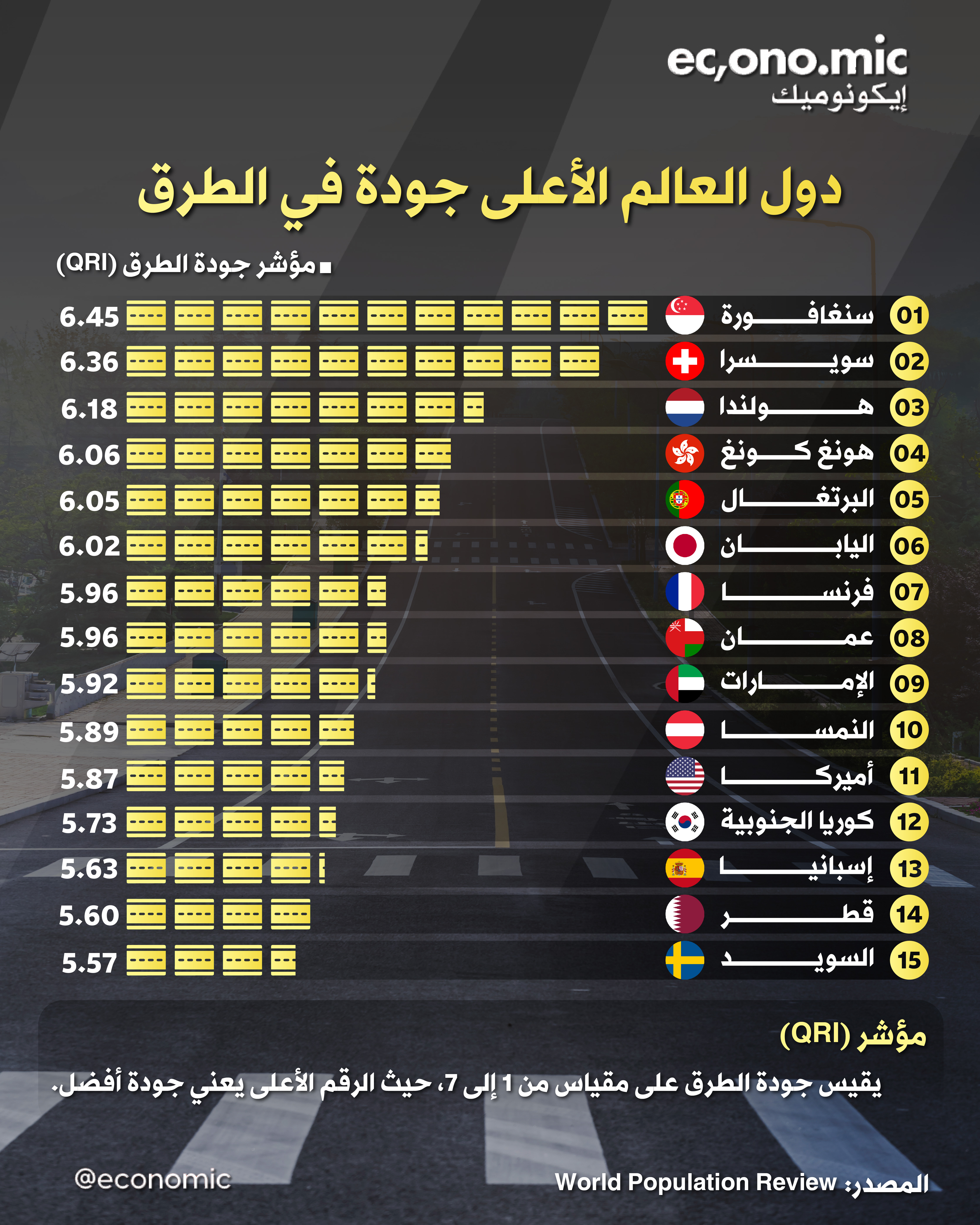 تصنيف دول العالم الأعلى جودة في الطرق وفق مؤشر جودة الطرق QRI