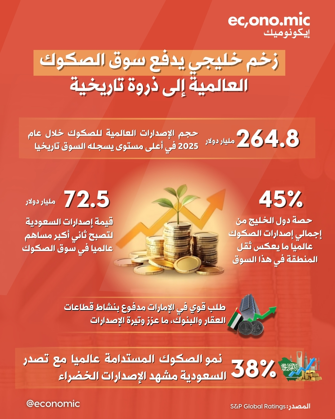يعكس هذا الإنفوجرافيك كيف تحوّلت دول الخليج إلى المحرّك الأساسي لنمو سوق الصكوك العالمي في 2025، مع تسجيل إصدارات قياسية، وتصدّر السعودية للمشهد، وارتفاع الطلب في الإمارات، بالتوازي مع تسارع واضح في الصكوك المستدامة