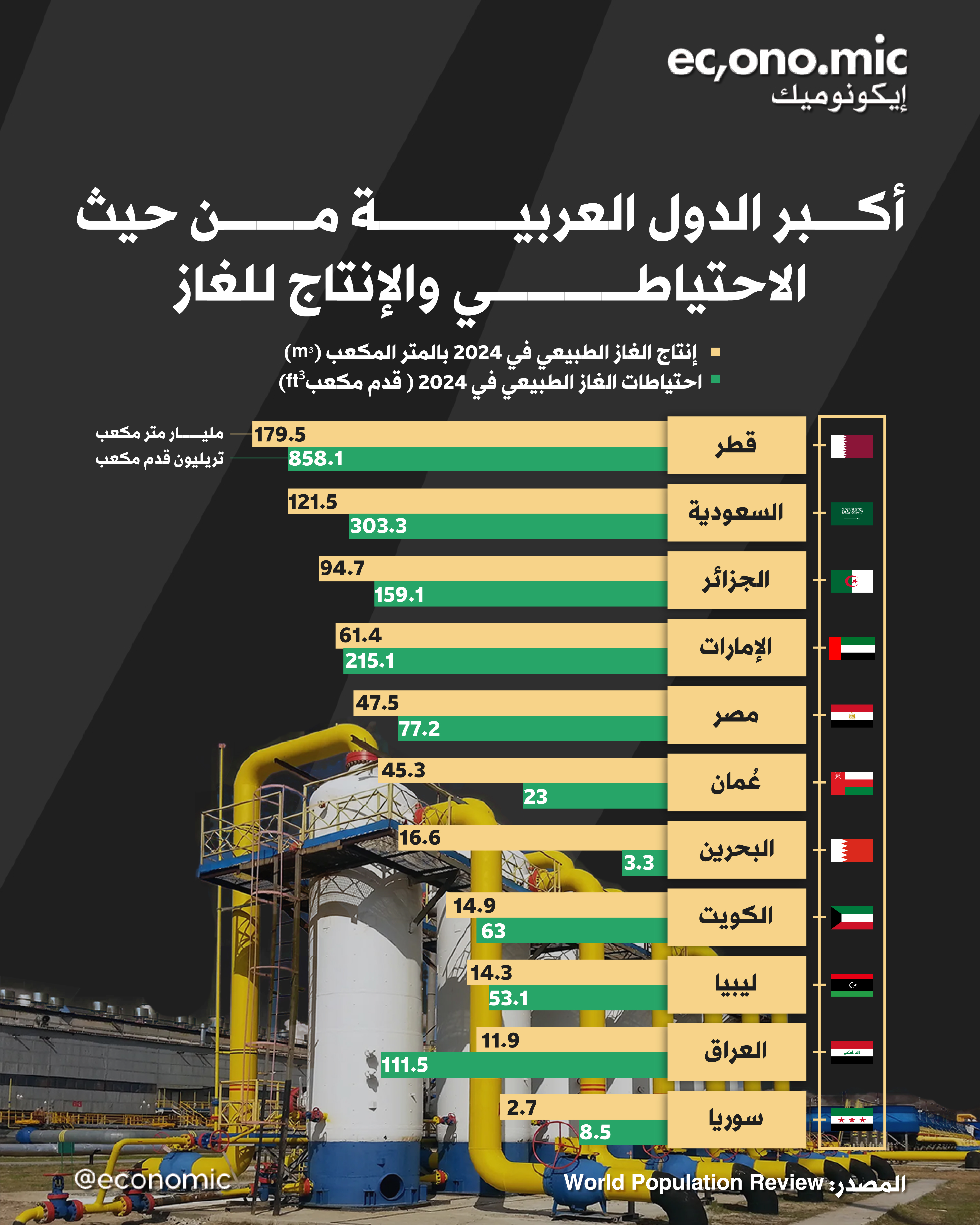 كما شملت قائمة الدول العربية المتصدرة في احتياطي وإنتاج الغاز الطبيعي كل من ( الجزائر، الإمارات، مصر، عمان، البحرين).
