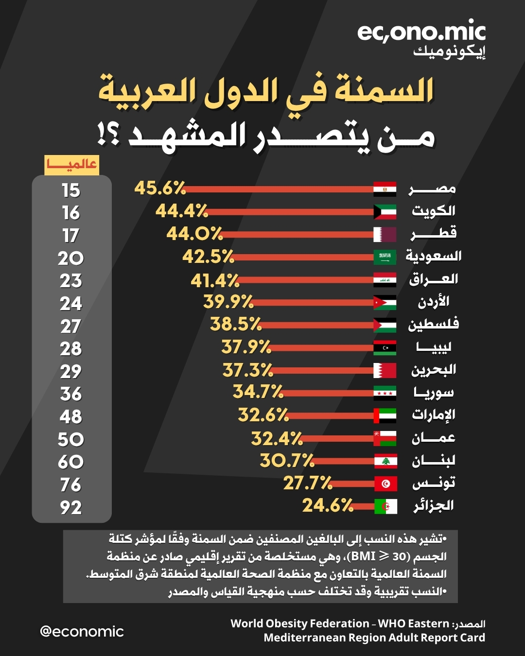 مصر الكويت وقطر ضمن أول 20 دولة في العالم من حيث انتشار السمنة بين البالغين، وفق أحدث بيانات Global Obesity Observatory لعام 2025