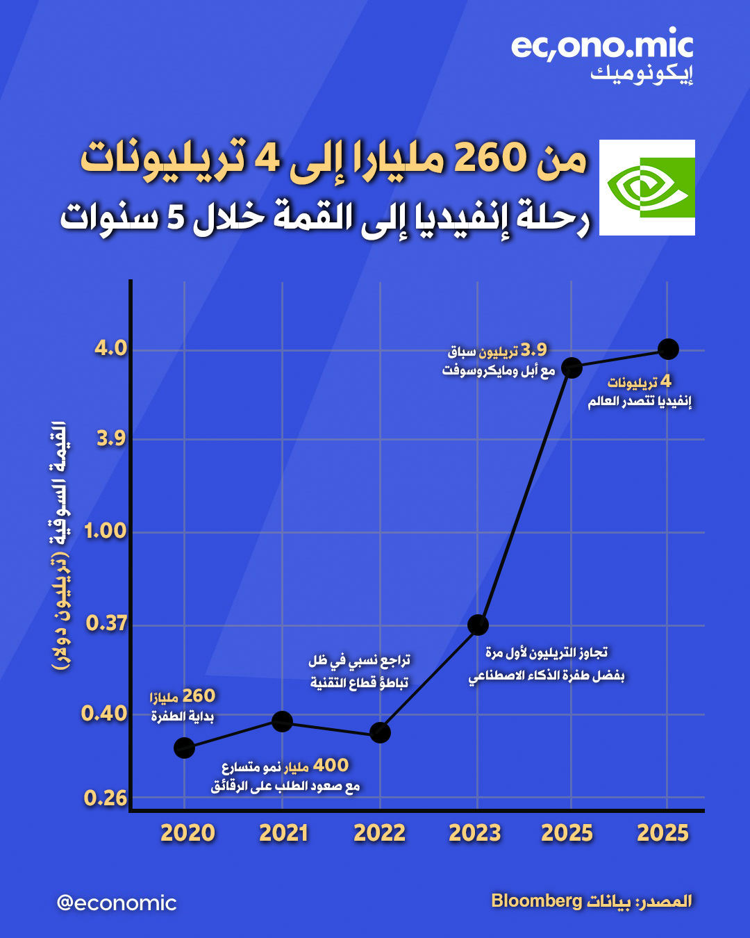 في أقل من خمس سنوات تضاعفت قيمة إنفيديا أكثر من 15 مرة لتصبح أول شركة عامة في التاريخ تتجاوز 4 تريليونات دولاررحلة غير مسبوقة بدأت من 260 مليارًا في 2020 وانتهت بقمة عالمية في يونيو 2025